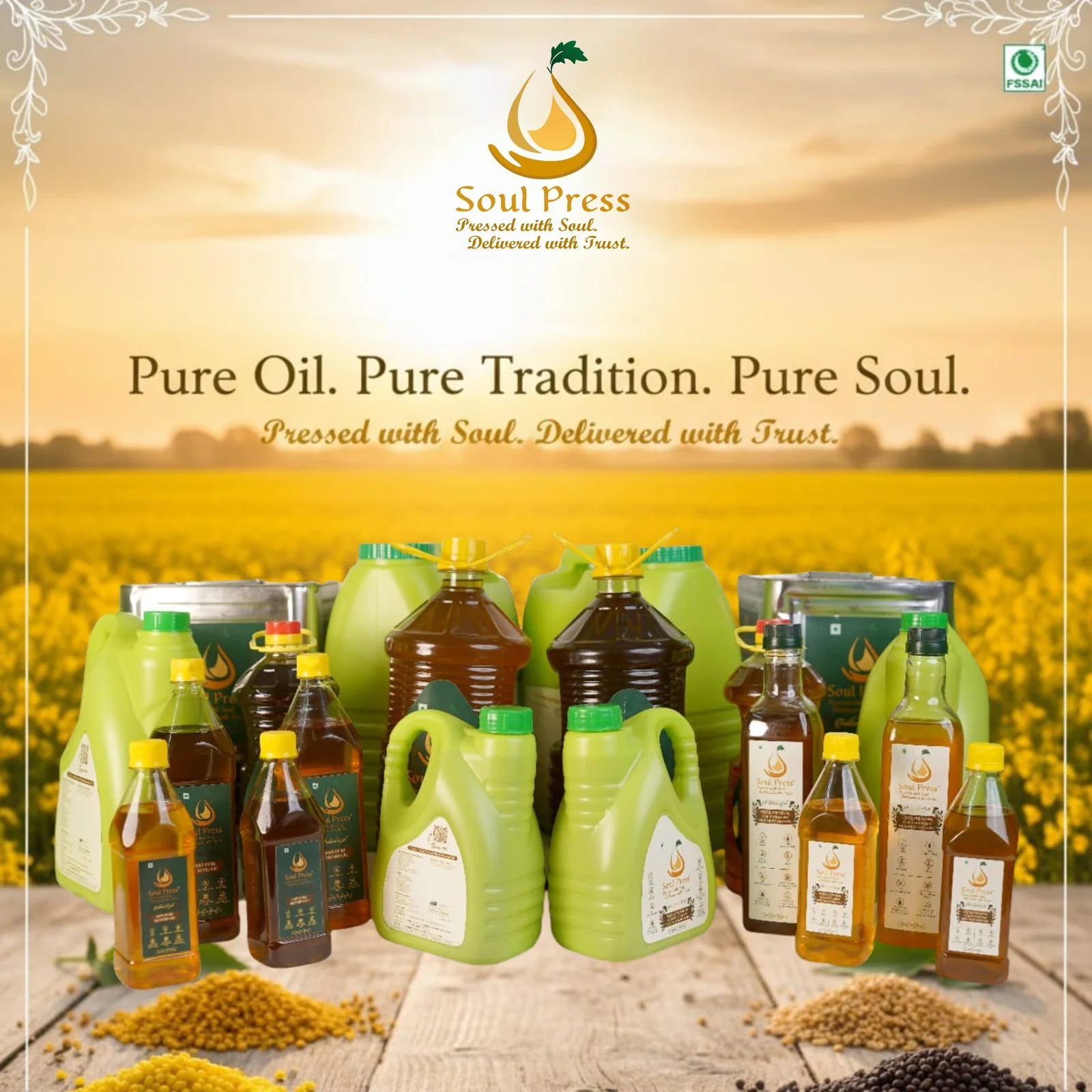 Soul Press Naturals was born out of a simple yet powerful question that touches every Indian kitchen: “If oil is meant to be eaten, why do we add chemicals?” Our brand brings a fresh perspective grounded in a deep respect for tradition, nourishment, and authenticity. We recognized the growing concern among families about the hidden ingredients in everyday cooking oils—often masked by palm oil, soybean oil, and synthetic additives that compromise health and flavor. Every drop of our oil is extracted from the finest mustard seeds, ensuring purity, nutrition, and a connection to the roots of Indian cooking.