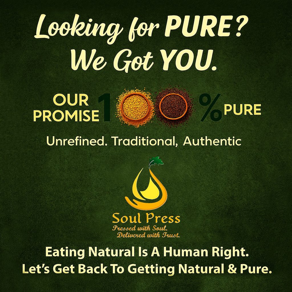 To revive the ancient wisdom of purity in every Indian kitchen by offering oils made the natural way — 100% pure, chemical-free, and unrefined. At Soul Press, we envision a world where nourishment is rooted in authenticity, and every drop of oil carries the essence of health, tradition, and trust.