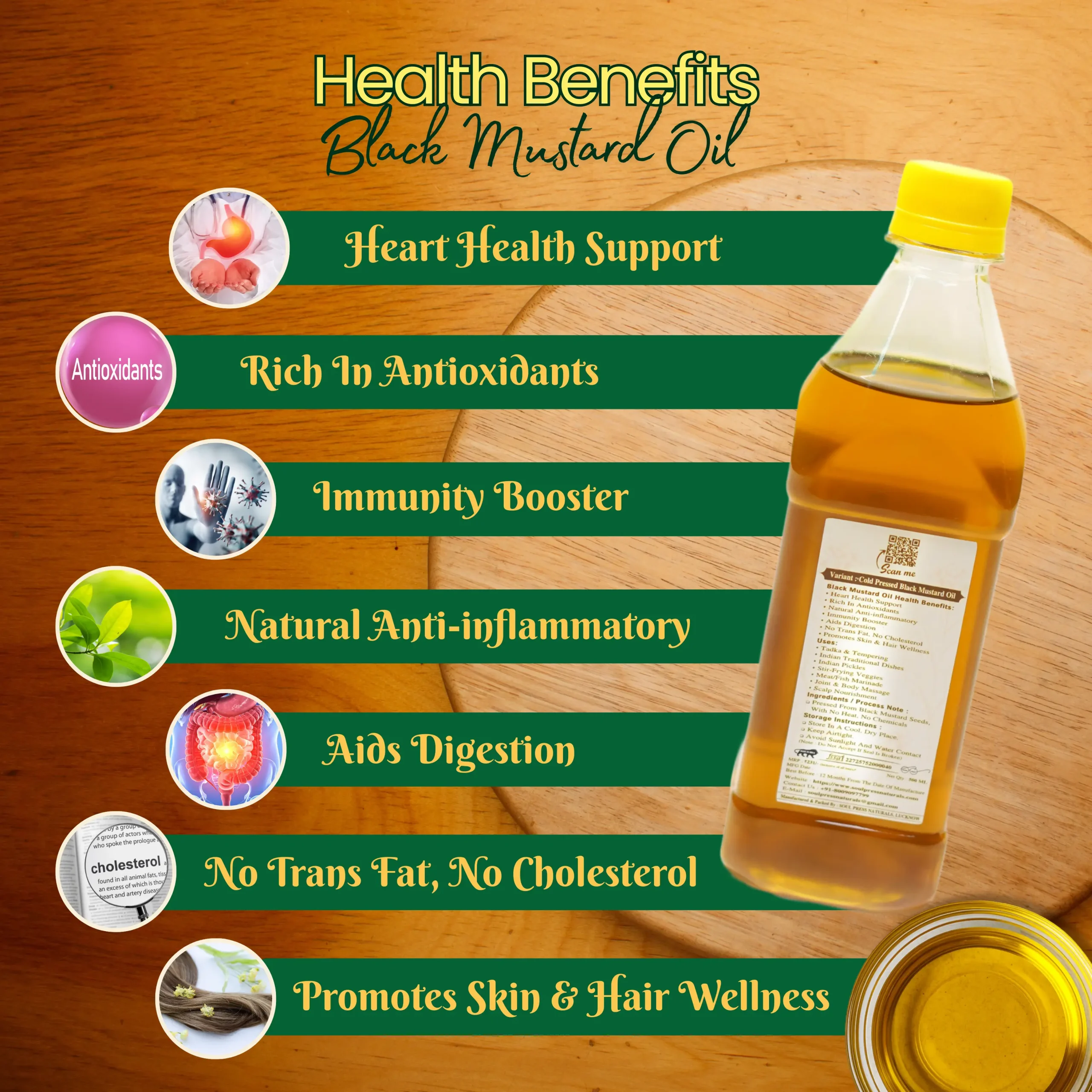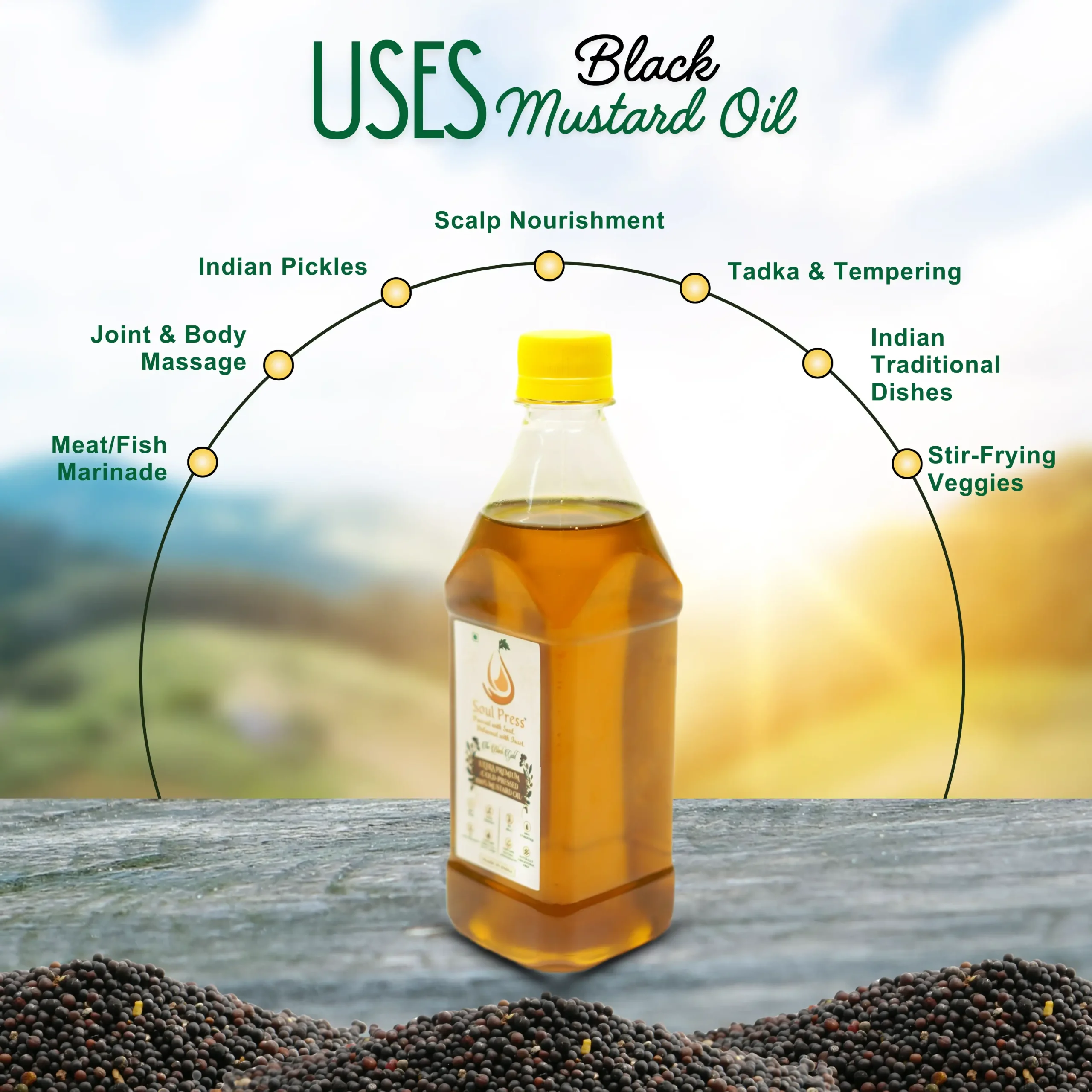 Soul Press Naturals Cold Press Black Mustard Oil is extracted from premium black mustard seeds using a slow, chemical-free cold-press process that preserves its natural aroma, pungency, and nutritional value. Rich in antioxidants and natural anti-inflammatory properties, it supports heart health, digestion, immunity, and overall wellness.
