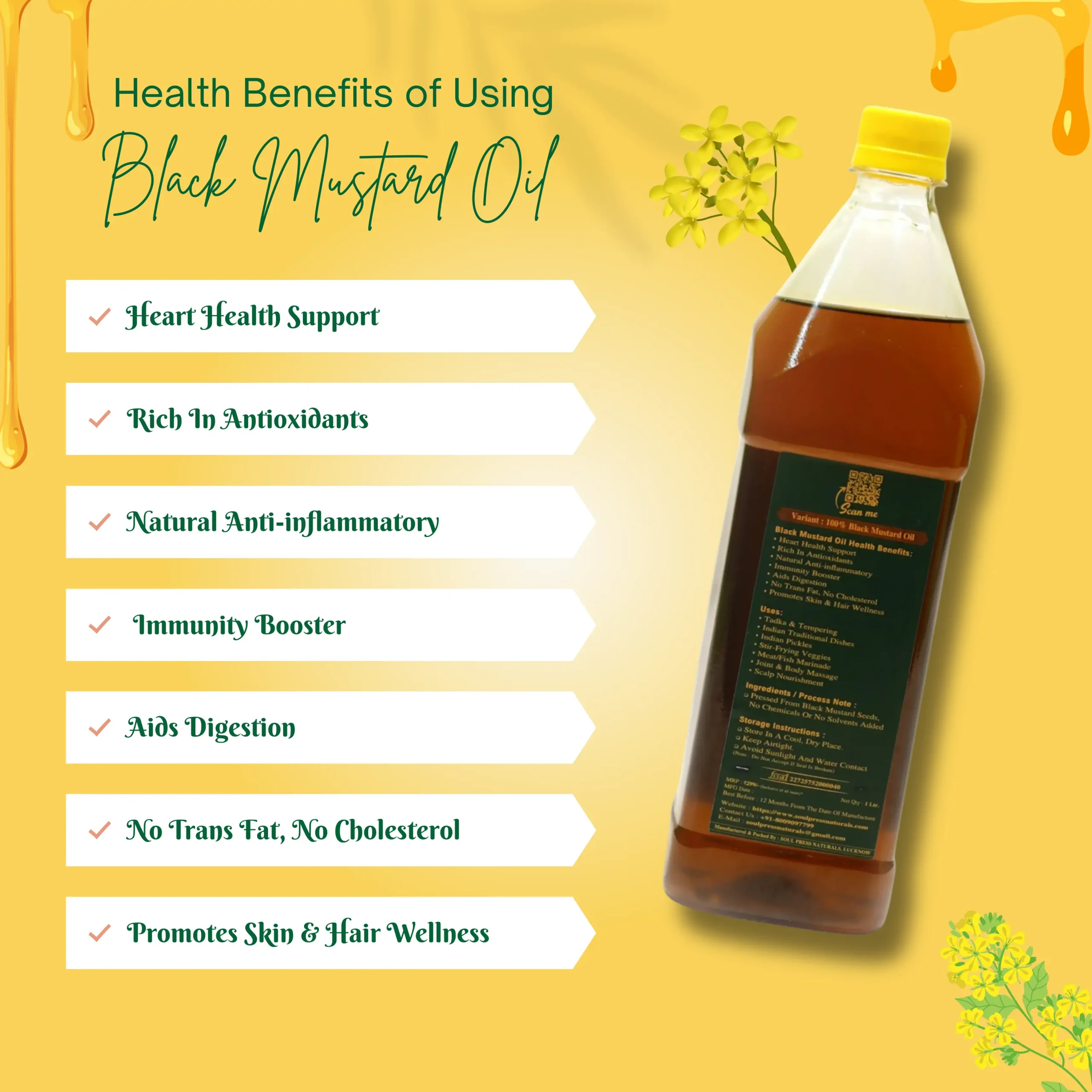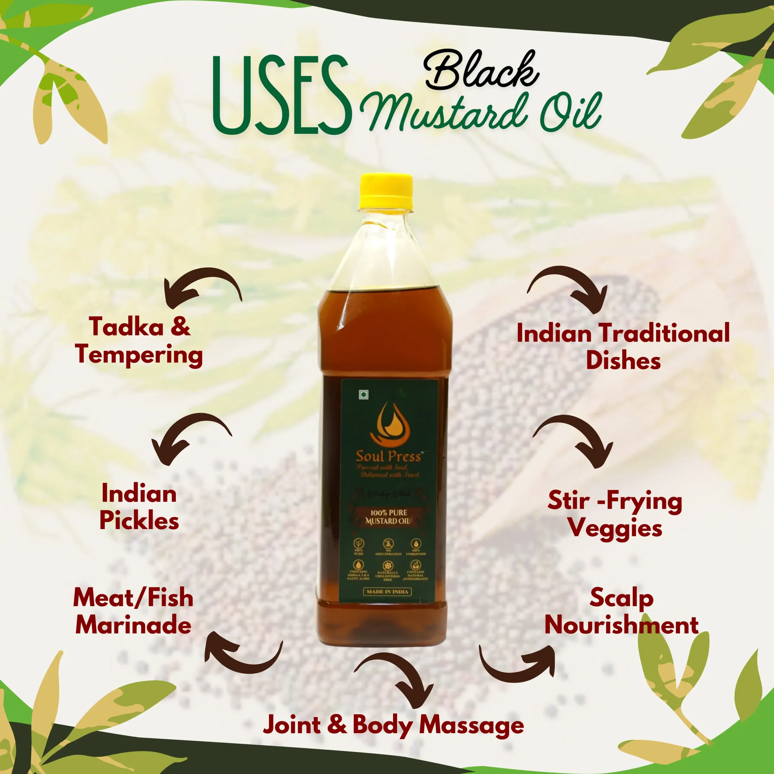 Soul Press Naturals Traditional Press Black Mustard Oil is crafted using age-old pressing methods from premium black mustard seeds, without chemicals or refining. Rich in antioxidants and natural anti-inflammatory properties, it supports heart health, digestion, immunity, and skin & hair wellness. With its bold aroma and authentic taste, it is ideal for tadka, Indian cooking, pickles, stir-frying, marinades, and traditional massage and scalp nourishment.
