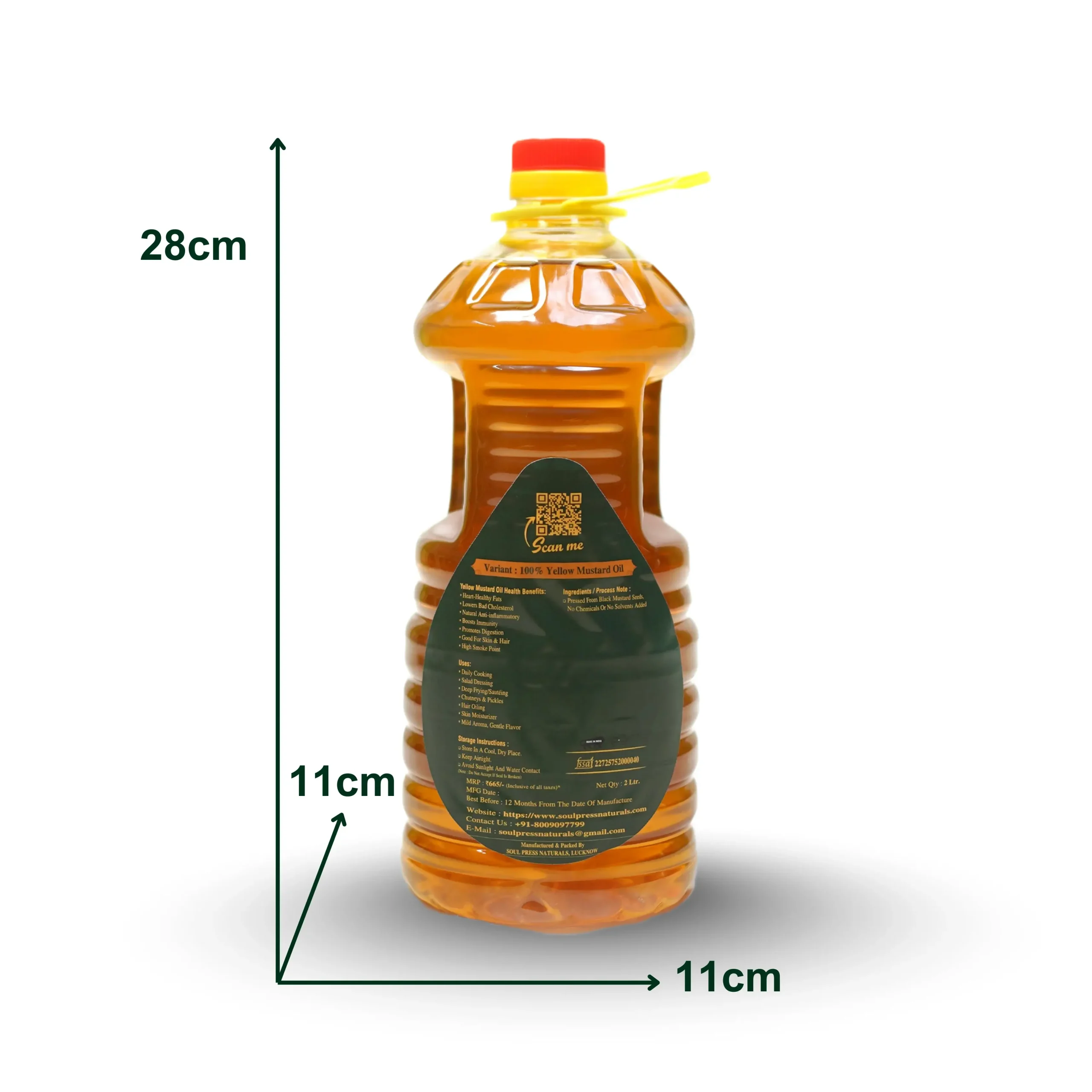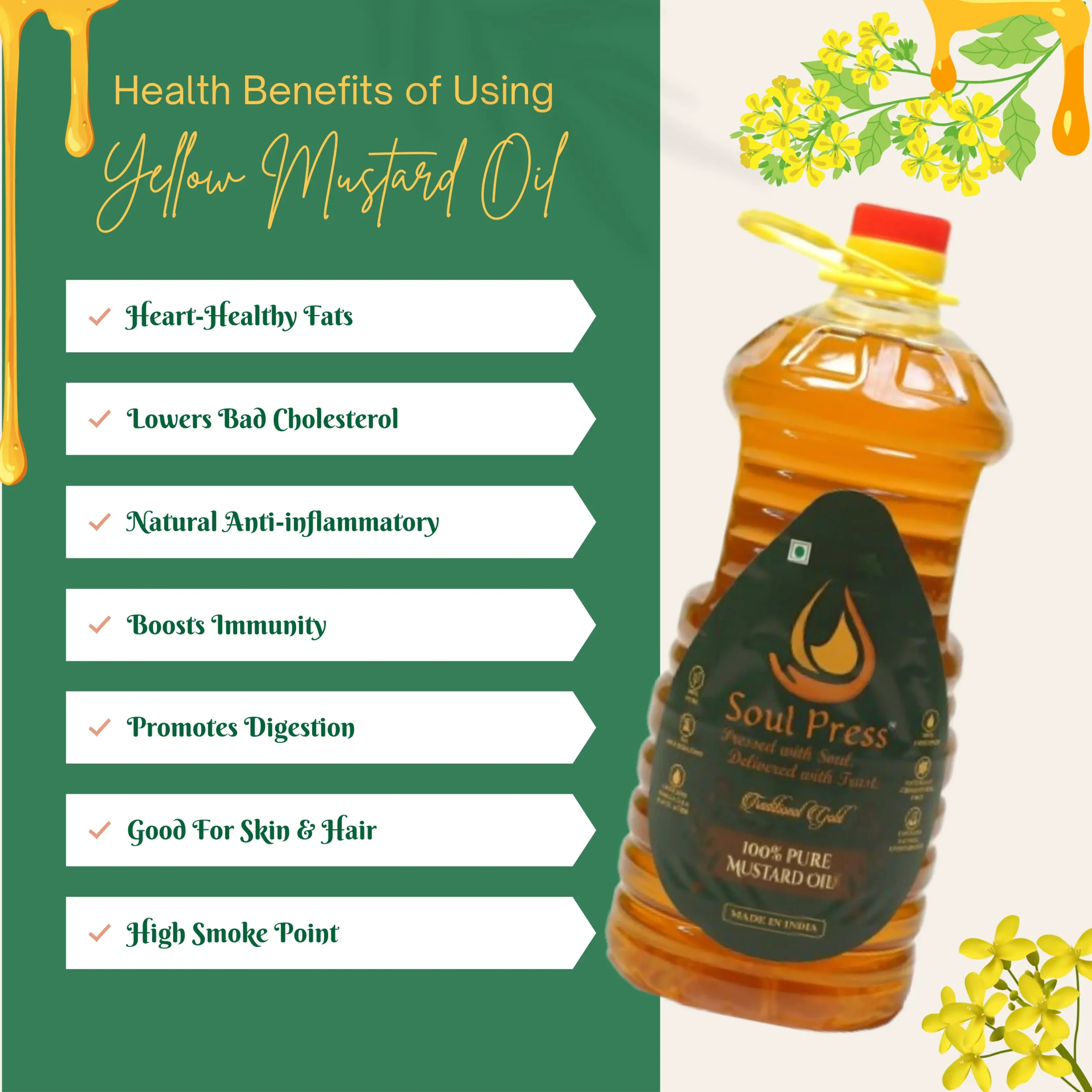 Soul Press Naturals Traditional Press Yellow Mustard Oil is prepared using time-honoured pressing techniques from premium yellow mustard seeds, without chemicals or solvents. Rich in heart-healthy fats and natural antioxidants, it supports digestion, immunity, and skin & hair wellness. With a mild aroma, gentle flavour, and high smoke point, it is ideal for daily cooking, salad dressings, sautéing, chutneys, pickles, and traditional hair and skin care.
